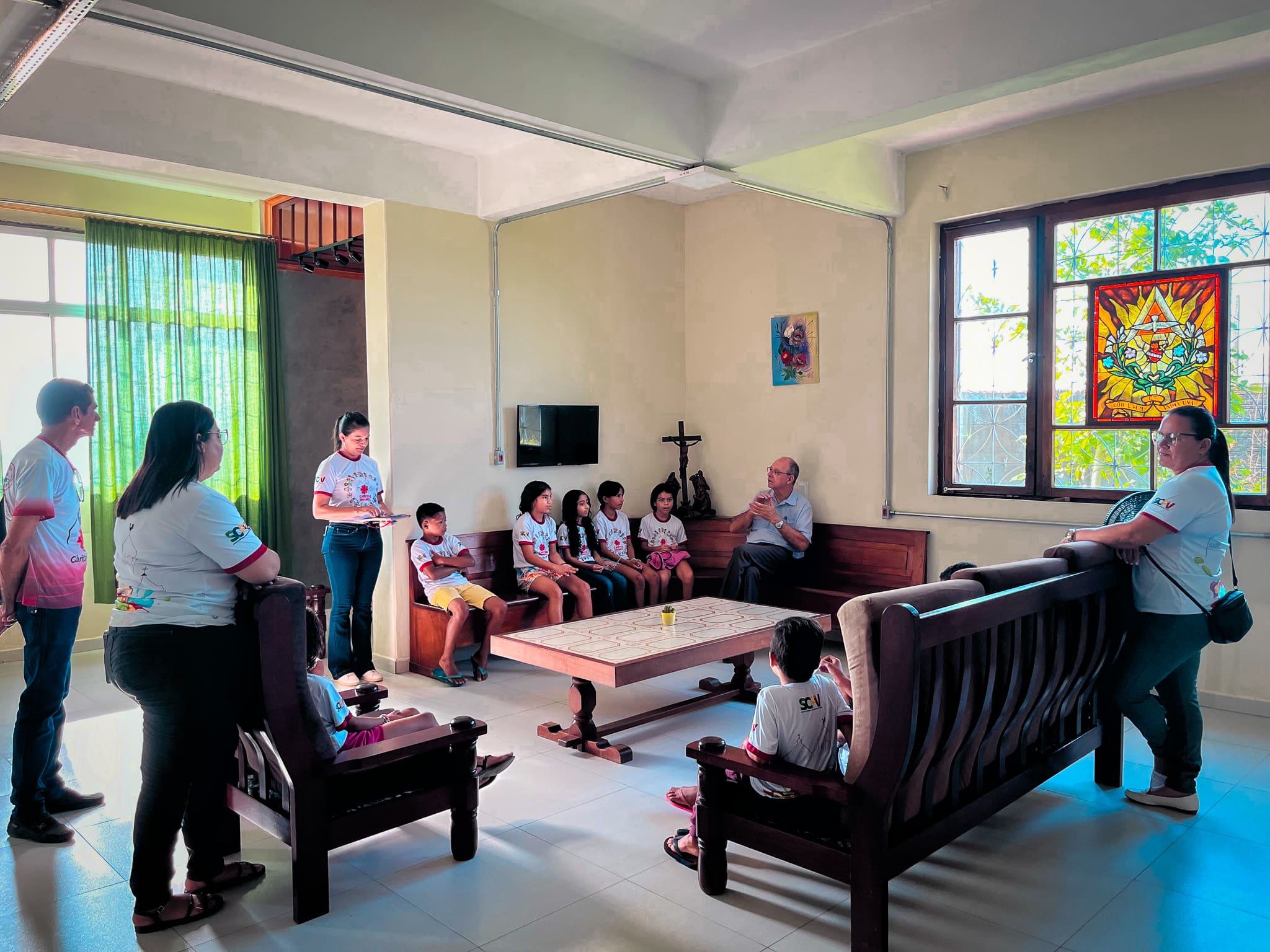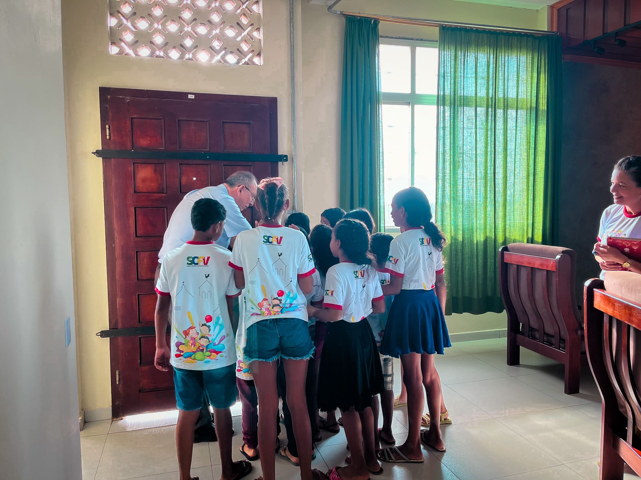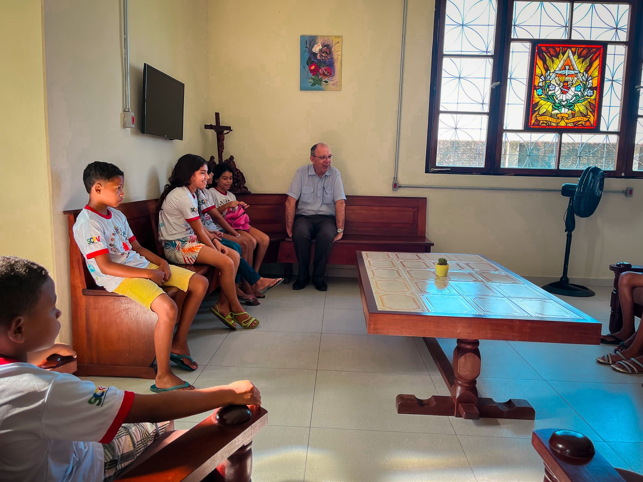 Foi feito uma roda de conversa entre Dom Flávio e as crianças, e elas foram fazendo algumas perguntas ao Bispo de curiosidades para conhecê-lo melhor. Foi uma manhã bem alegre ao lado das crianças, que ao final entregaram uma carta para Dom Flávio demonstrando o carinho pelo querido Bispo.