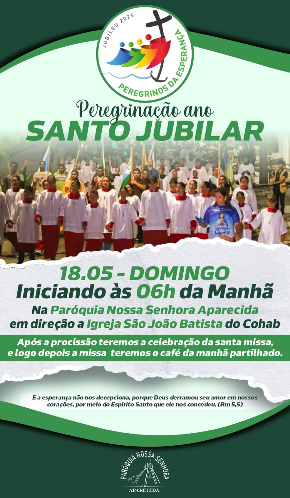 Estamos vivenciando o Ano Santo Jubilar, um tempo especial de graça, meditação e renovação espiritual. Em comunhão com esse tempo de bênçãos, a Paróquia Nossa Senhora Aparecida da cidade de Cruzeiro do Sul (AC) realizará sua peregrinação no dia 18 de maio. Com saída às 6h da manhã na frente a igreja matriz da Paróquia rumo à Igreja São João Batista, na Cohab.