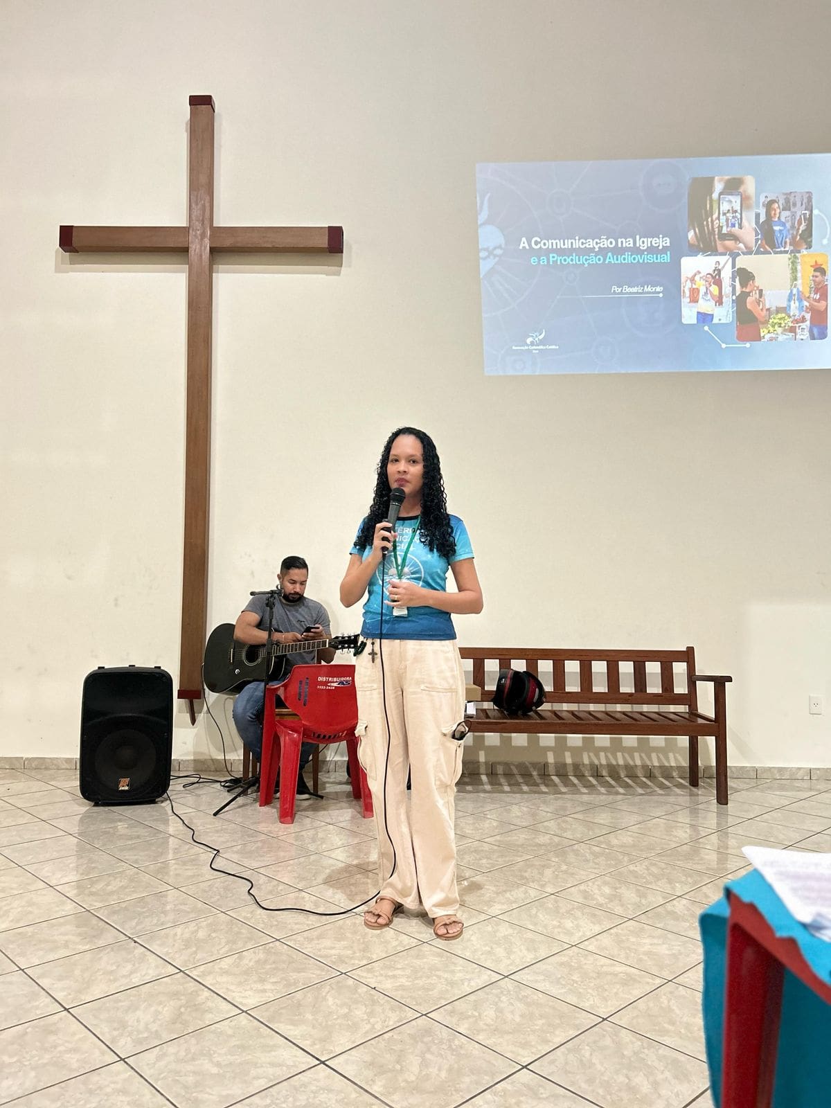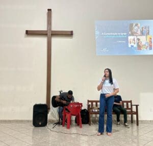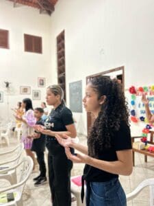 A encontro iniciou com momento de louvor e espiritualidade e logo após a formação com o tema “A Comunicação na Igreja e a Produção Audiovisual” com a formadora Beatriz Monte.